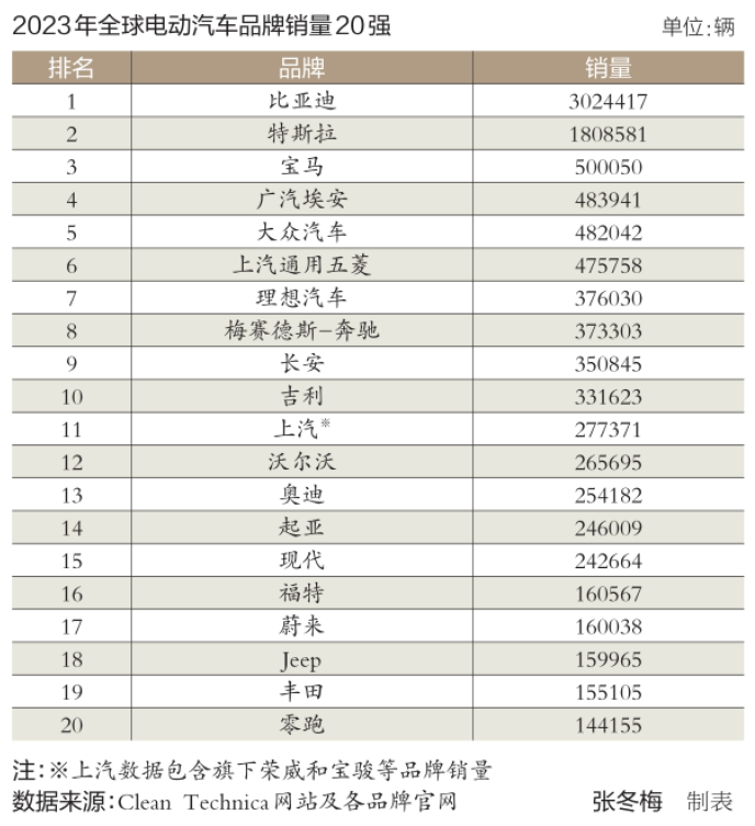 特斯拉排名第二,销量支柱是Model Y与Model 3两款车型,尤其是前者。2023年,特斯拉多次掀起“价格战”,推动Model Y销量猛涨。不过,降价策略对利润造成了影响。2023年特斯拉的营收达967.7亿美元,同比增长19%;净利润达150亿美元,同比上升19%。不过,营业利润率为9.2%,同比下滑7.6个百分点;毛利率为18.2%,较2022年下滑7.35个百分点。部分华尔街机构对其利润率及需求前景表示担忧,摩根士丹利警告称,电动汽车供需失衡可能会给特斯拉带来压力。