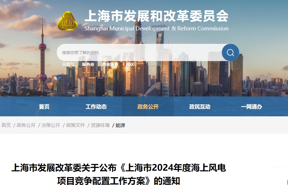 上海市发展改革委关于公布《上海市2024年度海上风电项目竞争配置工作方案》的通知