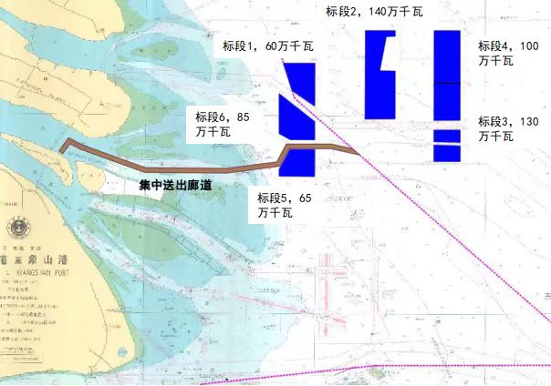 标段6(崇明海上风电一期项目):位于崇明岛东部市管海域,场址东侧避让长江口内航路,西侧避让生态保护红线,南北两侧避让通信管线,规划装机容量85万千瓦,场址中心离岸距离约50公里,场址面积约86.3平方公里。