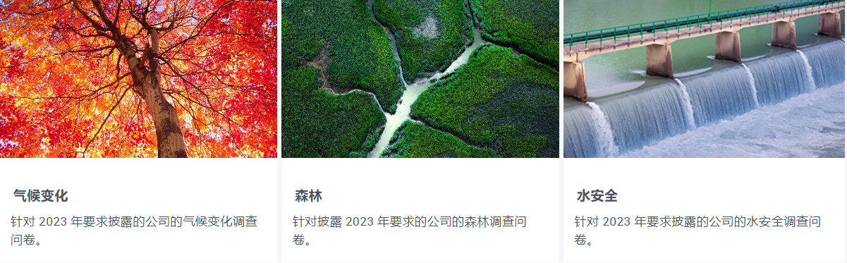 参与评级的企业需要在每年下半年的截止日期前填写线上相关调查问卷。CDP调查问卷与气候相关财务披露工作组 (TCDF) 保持一致,该工作组要求公司或政府报告与财务相关的可持续性、环境和气候风险。