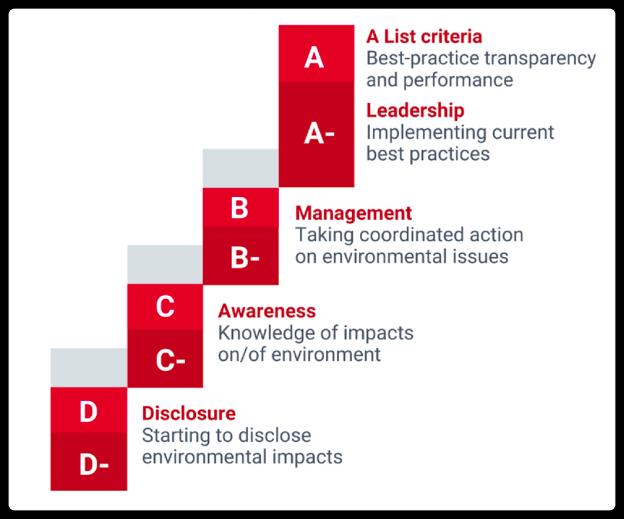 能获得A-,代表这三家公司在环境和气候方面表现已经出了极强的领导力。公司在气候变化、森林砍伐和/或水资源管理方面的报告都具有透明度,并制定了减少环境影响的战略,包括明确的科学目标 (SBTi) 以及贯穿其运营和价值链的相关行动计划。