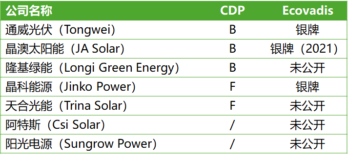 通威光伏和晶科能源在2023年都获得了EcoVadis的银牌,而晶澳太阳能也曾在2021年获得了银牌,最新信息尚未披露。