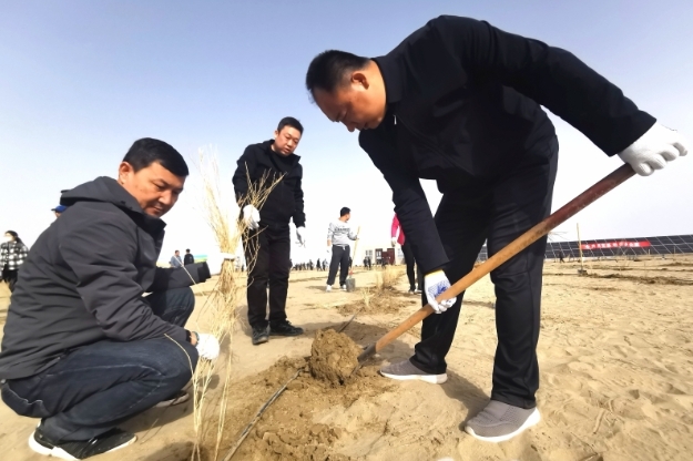 3月23日上午,沙雅县1300多名干部群众来到该县盖孜库木乡东片区造林点,挖坑、培土,在沙地上栽下株株梭梭苗。不远处,一排排光伏板整齐排列,到今年7月,这里将初步形成光伏发电+梭梭种植的新型治沙产业园。