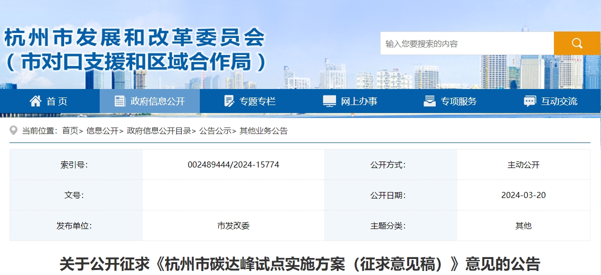 日前,浙江省杭州市发展和改革委员会发布关于公开征求《杭州市碳达峰试点实施方案(征求意见稿)》意见的公告。