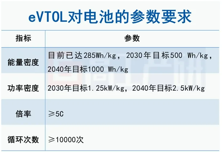 同时,极高的安全性也对航空电池带来了极大的挑战。美国FAA第23部分认证要求是使发生事故的概率在千万分之一,而欧盟EASA要求的是十亿分之一的事故率。此外,在与eVTOL飞行性能有关的比功率(功率密度)和决定电池的寿命的循环次数方面,eVTOL对电池的要求也更加严苛。