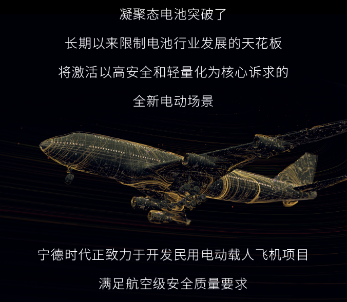 随后,宁德时代在去年4月发布了凝聚态电池,该款电池实现了高比能以及高安全兼顾,单体能量密度最高可达500Wh/kg,为其海陆空全域电动化战略奠定了坚实的基础。当时,宁德时代首席科学家吴凯介绍称,宁德时代正在进行民用电动载人飞机项目的合作开发,执行航空级的标准和测试,以满足相关航空机的安全与质量要求等。