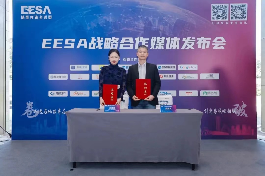 新能源产业家主编张真真(左)、储能领跑者联盟秘书长段明星(右)正式签约“新能源世界会客厅”项目