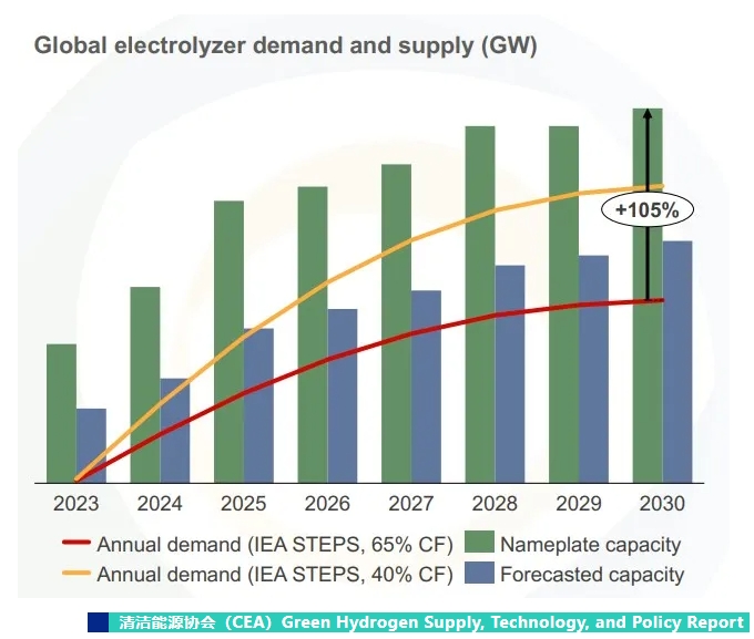 不止一家机构预测全球电解槽将迎来过剩,今年2月份,清洁能源协会(CEA)发布了的Green Hydrogen Supply, Technology, and Policy Report给出了类似的预测。