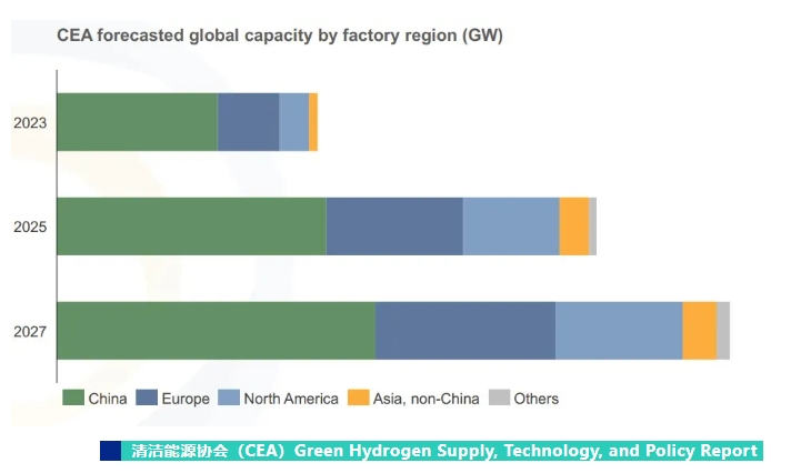 报告预测,到2027年,中国将继续占据全球产能的近一半。中国、北美和欧洲将共占全球电解槽产能的93%市场份额;由于完整的供应链和低成本,中国目前占全球制造能力的约61%,并将继续占到2025年和2027年总产能的大约一半。