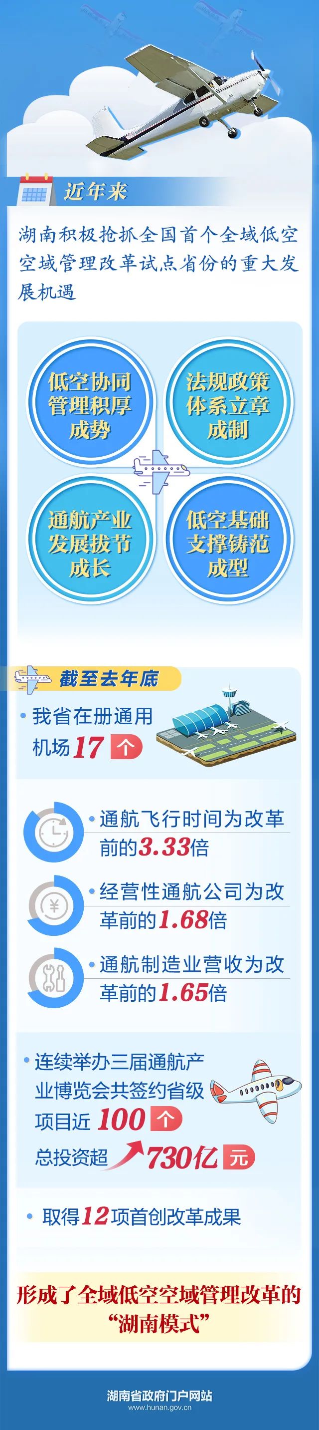 毛伟明对湖南省低空空域管理改革试点成效表示肯定。他说,近年来,湖南积极抢抓全国首个全域低空空域管理改革试点省份的重大发展机遇,低空协同管理积厚成势,法规政策体系立章成制,通航产业发展拔节成长,低空基础支撑铸范成型。截至去年底,湖南省在册通用机场17个,通航飞行时间、经营性通航公司、通航制造业营收分别为改革前的3.33倍、1.68倍、1.65倍,连续举办三届通航产业博览会共签约省级项目近100个、总投资超730亿元,取得12项首创改革成果,形成了全域低空空域管理改革的“湖南模式”。