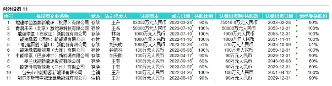企查查显示,中能建氢能目前已对外投资11家企业,包括能建绿氢(石家庄)新能源有限公司、能建绿色氢氨新能源(松原)有限公司,以及青启未来(北京)氢能源科技有限公司等在内。
