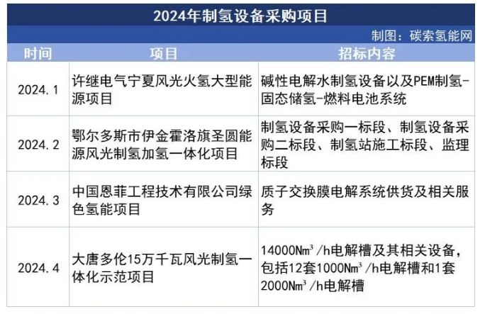 据碳索氢能网梳理,截至4月11日,2024年公开的制氢设备招标项目仅4个,分别为许继电气宁夏风光火氢大型能源项目、鄂尔多斯市伊金霍洛旗圣圆能源风光制氢加氢一体化项目、中国恩菲工程技术有限公司绿氢能项目、大唐多伦15万千瓦风光制氢一体化示范项目。