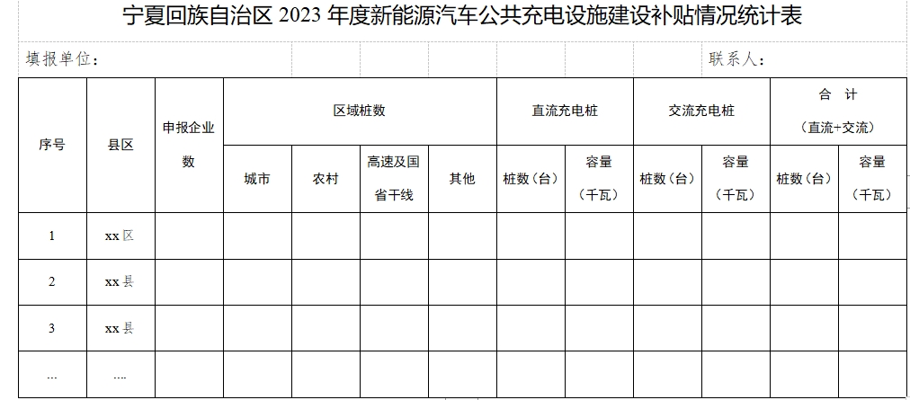 三是及时上报有关材料。5月25日前,以地市为单位上报新能源汽车公共充电设施建设补贴情况统计表及摸底名册,同时将电子版材料发送至能源发展处邮箱,邮箱地址nengyuan_nx@126.com。