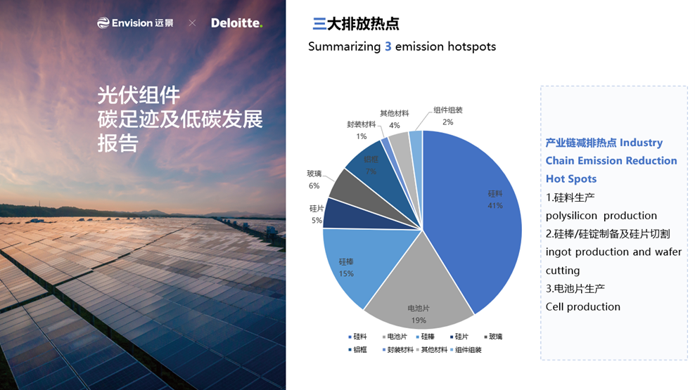 根据报告,光伏组件的碳排放是衡量其对环境的影响和可持续性的重要指标。光伏组件存在如下3大排放热点:一是硅料生产,二是硅棒/硅锭制备及硅片切割,三是电池片生产。