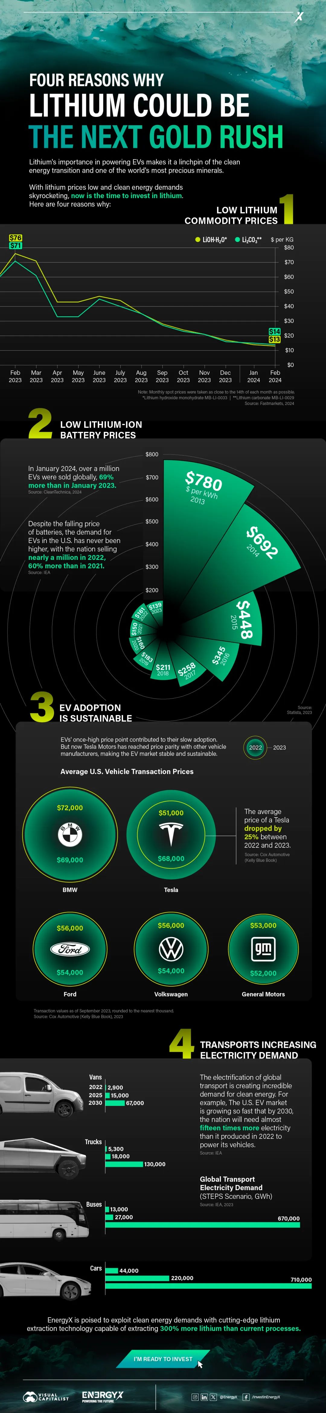 投资锂的最佳理由之一是,电动汽车是锂需求背后的主要驱动力之一,其价格已达到与传统汽车相似的水平。特斯拉的平均交易价格在2022年至2023年间下降了25%,与许多其他主要汽车制造商持平,并表明从消费者价格的角度来看,电动汽车是一种现实的交通工具。