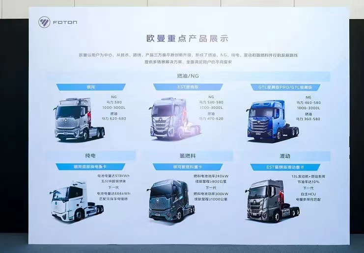 在车辆及移动装备布局上,福田汽车品类最全,已经覆盖253个场景,提供人和货自由移动全场景解决方案。同时,福田汽车不断加快新能源汽车产品布局,目前已形成涵盖纯电、混动、氢燃料全技术路线、覆盖全场景的商用车全系产品矩阵。在重卡、轻卡、微卡、皮卡、VAN、客车、专用车等全系列产品上得以应用。