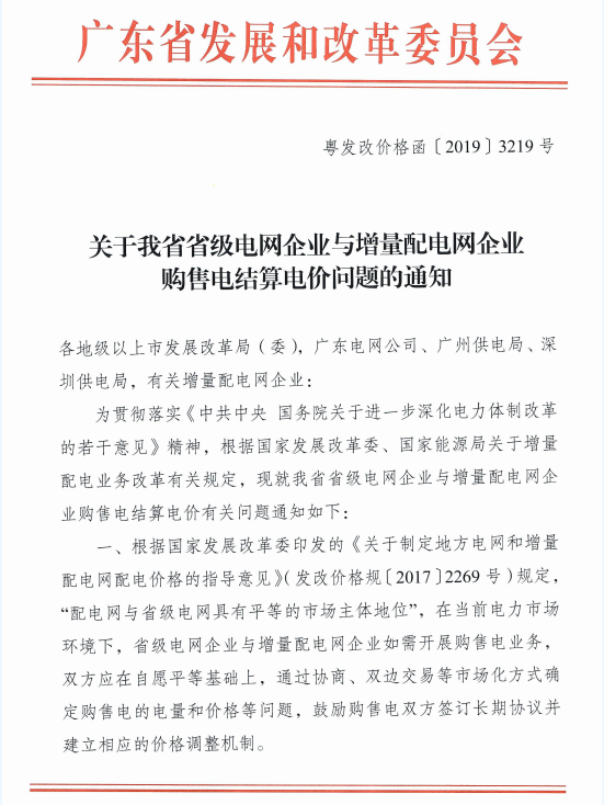 广东省级电网与增量配电网企业购售电结算电价:通过市场化方式确定电量和电价