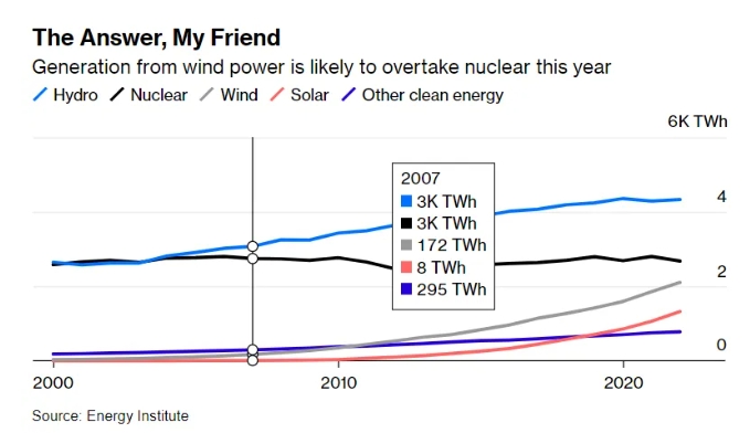 终于超过了2020年创下的95吉瓦的纪录,同比增速达到惊人的50%。全球风能协会发现2023年全球风力发电量接近2500太瓦时,相当于欧盟电网电量的90%。风电很可能在未来12个月内超越核能成为全球最大的清洁能源(仅次于水电)。