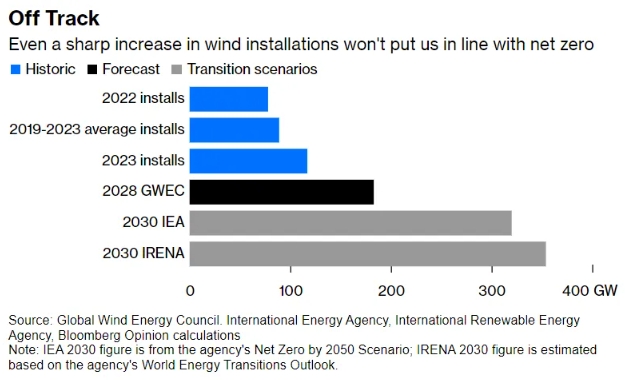 相比国际能源署评估的2030年年底前每年所需的320吉瓦新增装机容量,2023年的117吉瓦才刚超过三分之一。全球风能协会的当前预测是2030年全球风发总装机容量将达到2太瓦,而实现净零目标对应的数字是3太瓦。
