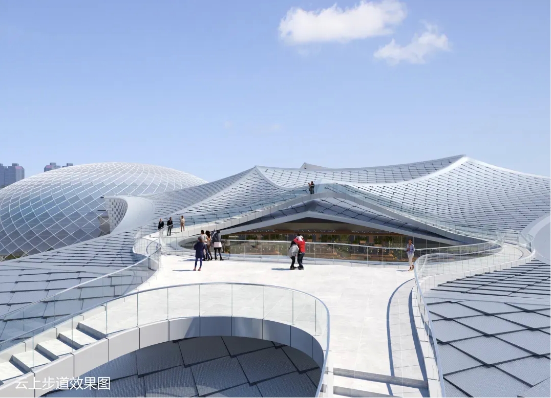 “金乌绕梁,墨麟龙甲”,无锡零碳科技产业园内在建中的无锡交响音乐厅屋面,应用了国内首创的“太阳能龙鳞屋顶创新技术”。这些状似“龙鳞”的光伏板表面带有纹理,光伏板之间的连接点采用三向变轴调节支座,使得龙鳞光伏板与建筑屋顶完美结合,可在各个角度迎合日光照射生产电力,并提供遮罩,有助于调节室内气温、湿度。