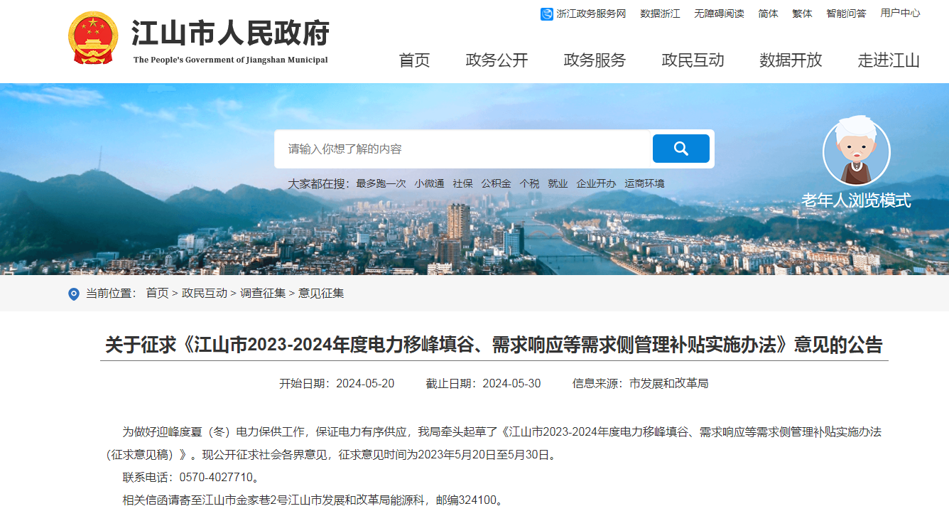 日前,浙江江山市人民政府征求《江山市2023-2024年度电力移峰填谷、需求响应等需求侧管理补贴实施办法》意见。