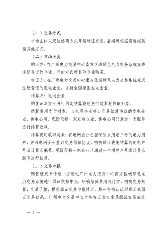 购售证双方任意一方通过广州电力交易中心南方区域绿色电力交易系统进行绿证交易申报,明确结算费用收付方、明确交易数量、交易价格,提交绿证交易申报情况,另一方确认后形成正式绿证交易结果。广州电力交易中心为购售证双方出具绿证交易成交单。