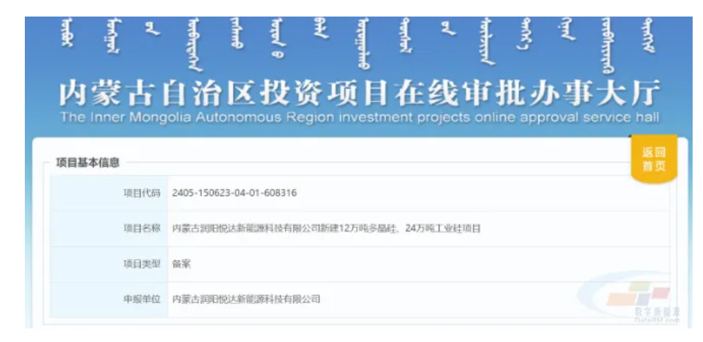 5月24日,内蒙古投资项目在线审批办事大厅发布消息,内蒙古润阳悦达新能源科技有限公司新建12万吨多晶硅、24万吨工业硅项目备案通过。