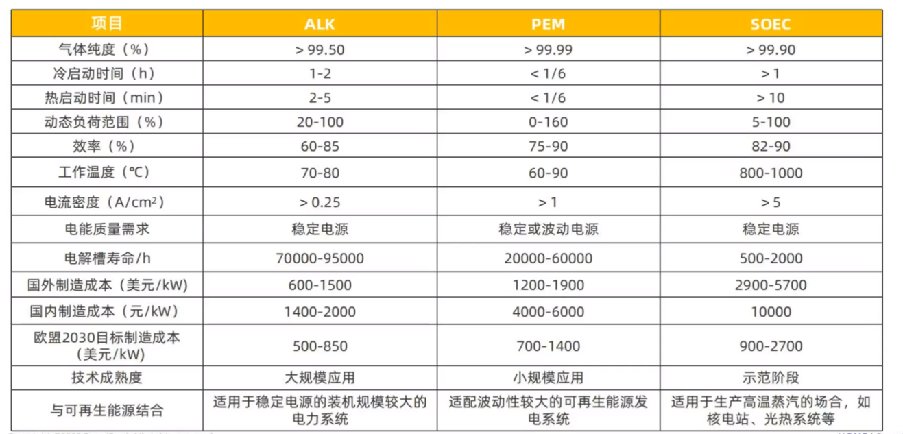 目前我国制氢电解槽市场中,碱性电解槽占据主要市场约占95%,PEM电解槽占5%左右,AEM和SOEC目前仍在实验室阶段,商业化程度较低。欧洲碱性电解槽和PEM电解槽的市场占比基本持平,未来中国电解槽市场PEM占有率将逐渐上升,欧洲国家在能源政策上会更加倾向于使用更适合风光储能的PEM路线,PEM启停速度快,由于政策的支持加上多年PEM的研发,PEM产品的成本和碱性电解槽的成本差距不大,性能和耐久性等也和碱性有一定的竞争力。