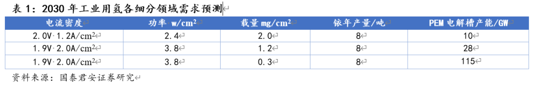 目前我国PEM产品并不成熟,成本保持在碱性电解槽的5-8倍,制氢功率电流密度和寿命等核心指标还未达到先进程度。目前国内厂商电流密度为1-1.2A/cm2,海外成熟厂商电流密度为2A/cm2;根据美国DOE目标,到2030年电流密度可提升至2.5-3A/cm2。参考海外成熟PEM厂商材料成本及用量,根据测算,电流密度从1A/cm2提升至2A/cm2,成本降低50%,提升至3A/cm2,成本降低67%。目前国内贵金属催化剂铱载量为2-4mg/cm2,海外成熟厂商贵金属催化剂铱载量为1.2mg/cm2;根据美国DOE目标,到2030年铱载量0.3mg/cm2。目前,铱年产量7-9吨(铱是铂的伴生矿,且高度集中于南非,铂年产量200吨左右,铱/铂的伴生比例1/25),按电解电压1.9V、电流密度2A/cm2,铱载量1.2mg/cm2可满足PEM电解槽年产能28GW,铱载量0.3mg/cm2可满足PEM年出货量115GW。