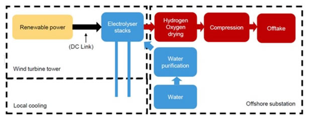 在英国商业、能源和工业战略部(BEIS)支持下进行“竞争性的氢能供应”的研究,能源储存和清洁燃料公司ITM Power与Ørsted提出了海上风电制氢的方案:将电解槽放置在风力涡轮机上,例如塔中或塔附近,直接与风力涡轮机中的电流连接来电解水。以氢气形式存在的能量将通过水下或地下管网输送到岸边,因为氢管道每公里的成本低于电力电缆,这样的直接制氢方案可降低制氢成本成本和能量损失。