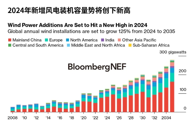 彭博新能源财经预计,2024年全球新增风电装机将增长6%,创下新高。未来两年,承购权和开发权竞价将蓬勃发展,从而增加陆上风电新增装机和进一步加速海上风电新增装机。到2035年,累计风电装机容量预计将增加两倍,与彭博新能源财经的《2024年新能源市场长期展望报告》中到2050年实现净零排放所需的目标相去甚远。