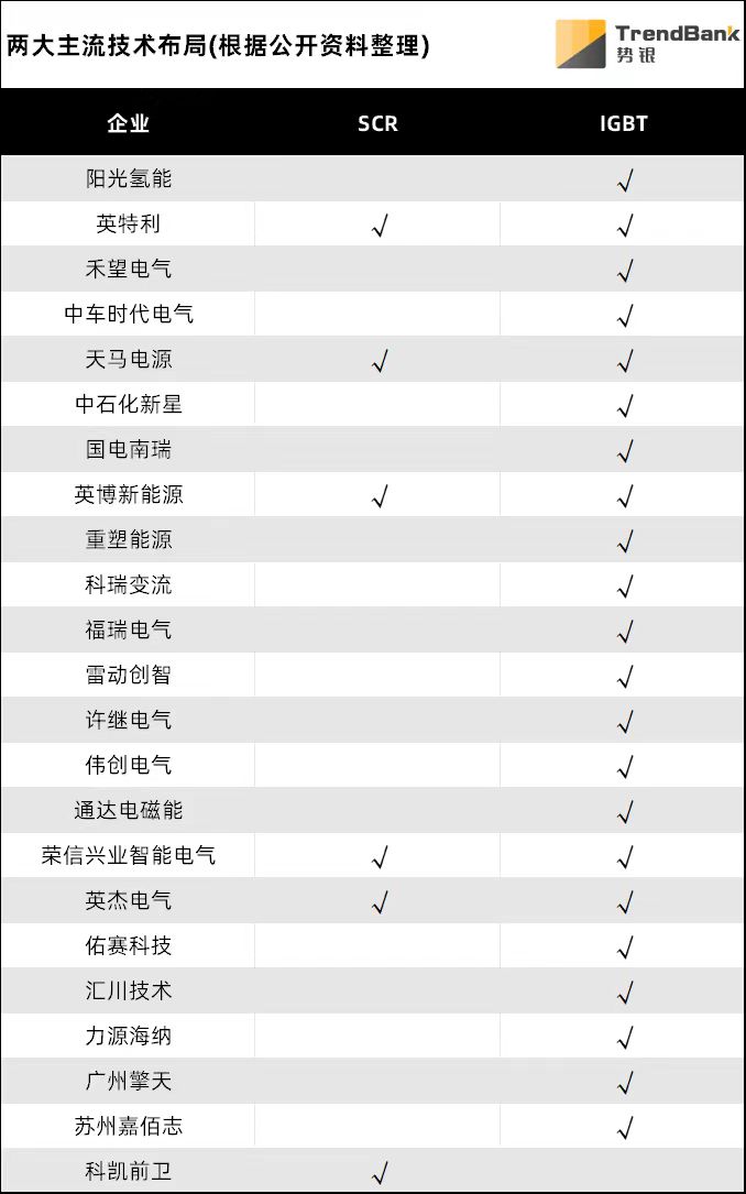 从当前技术环境来看,SCR制氢电源的应用场景更广,IGBT制氢电源对电网的保护性更强,对于电网能量波动的适应性也更强,随着大功率电解槽(MW)以及弱并网或纯离网的制氢场景的出现,IGBT制氢电源有望得到更广阔的应用空间。因此,从路线布局图中不难看出,玩家们在IGBT路线均有所布局,以阳光氢能、英特利、禾望电气为代表的企业,也已率先实现了绿氢项目中的批量化示范应用。