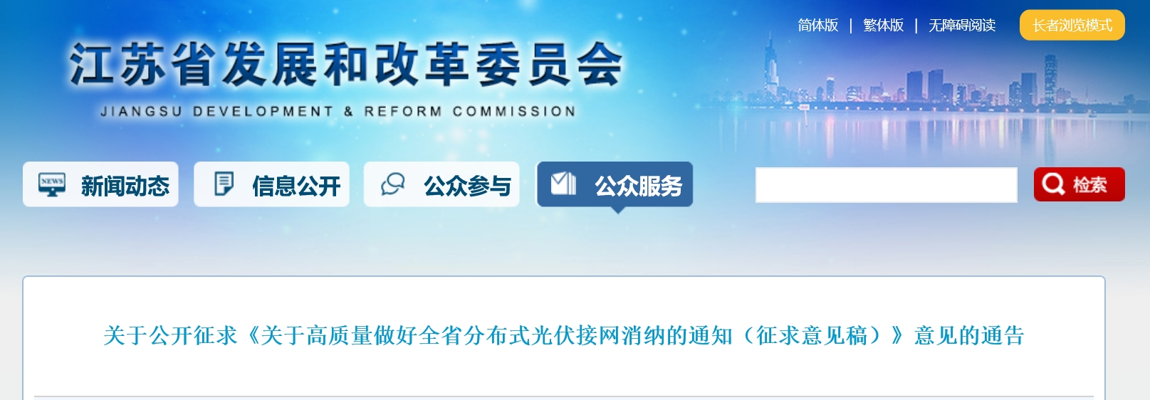 日前,江苏省发展和改革委员会发布关于公开征求《关于高质量做好全省分布式光伏接网消纳的通知(征求意见稿)》意见的通告。
