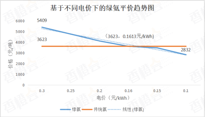 当可再生能源电价在0.3元/kWh的情况下,每吨绿色合成氨成本约为5409元/吨;可再生能源电价在0.1元/kWh的情况下,每吨绿色合成氨成本约为2265.43元。2023年传统合成氨的市场价格平均约3623元,经过测算若考虑绿氨能够和传统甲醇实现平价,则绿电价格需降至约0.1613元/kWh。
