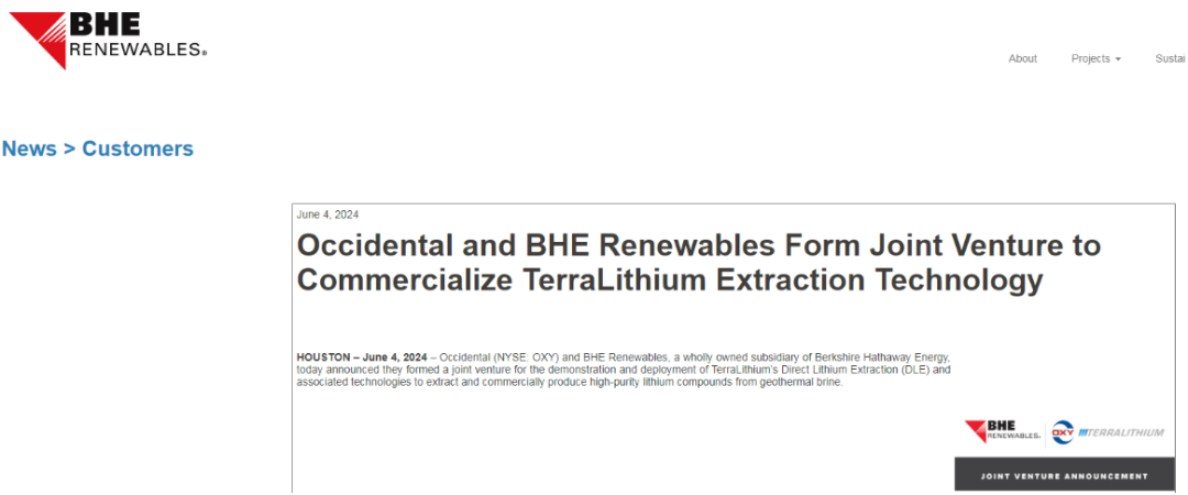 BHE Renewables在新闻稿中介绍,TerraLithium是西方石油公司的全资子公司,拥有DLE技术的专利,这些技术有可能将任何含锂卤水加工成高纯度锂。