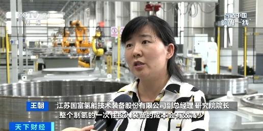 江苏国富氢能技术装备股份有限公司副总经理 研究院院长 王朝:电解槽每小时可以产生1000标方(标准立方米)的氢气,原来是在200标方(标准立方米)每小时以下。开发大标方(标准立方米)的电解槽产品,使得整个制氢的一次性投入装备成本会有效减少,单位制氢成本降低。