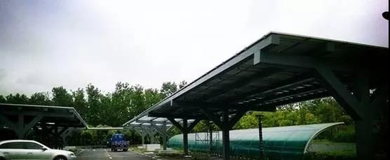 海洋大学停车棚安装的太阳能光伏系统的总容量为150kw,占面积1600平方米,共采用了5个30kw的逆变器。天气晴好的条件下,日均发电可达500-600度,通过供电部门安装的充电装置可为电动汽车充电,剩余电力并网。