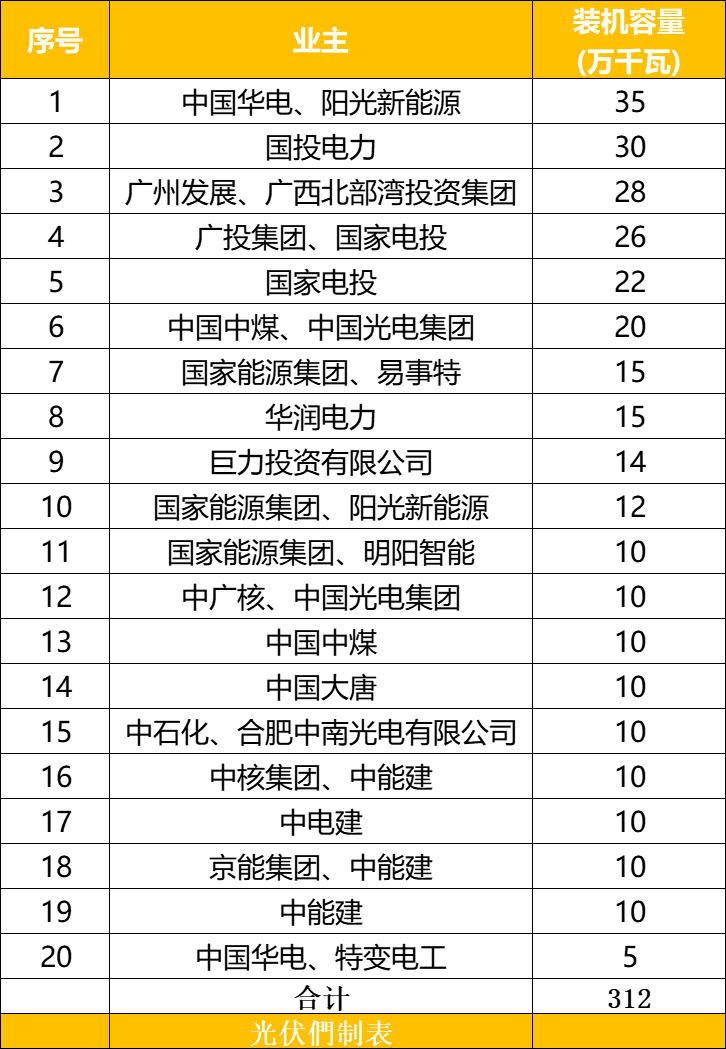 容量超过20万千瓦的还有广州发展&广西北部湾投资集团(28万千瓦)、广投集团&国家电投(26万千瓦)、国家电投(22万千瓦)、中国中煤&中国光电集团(20万千瓦)。