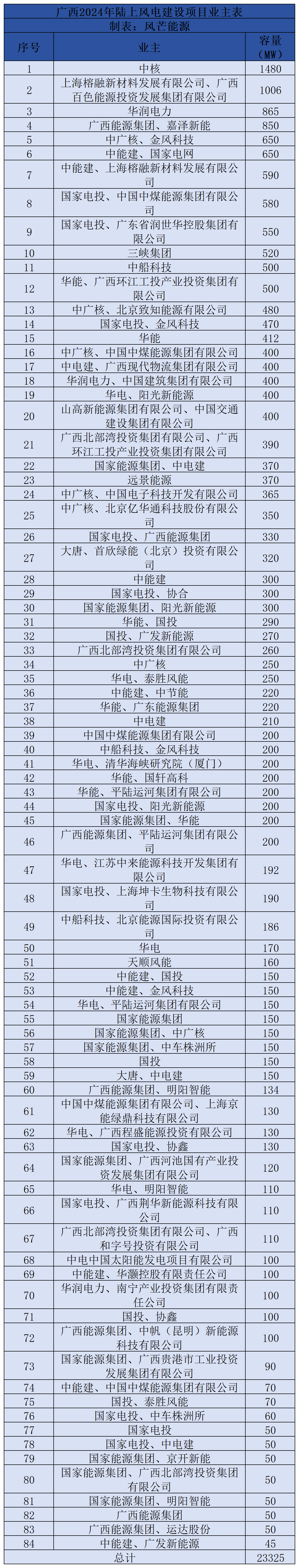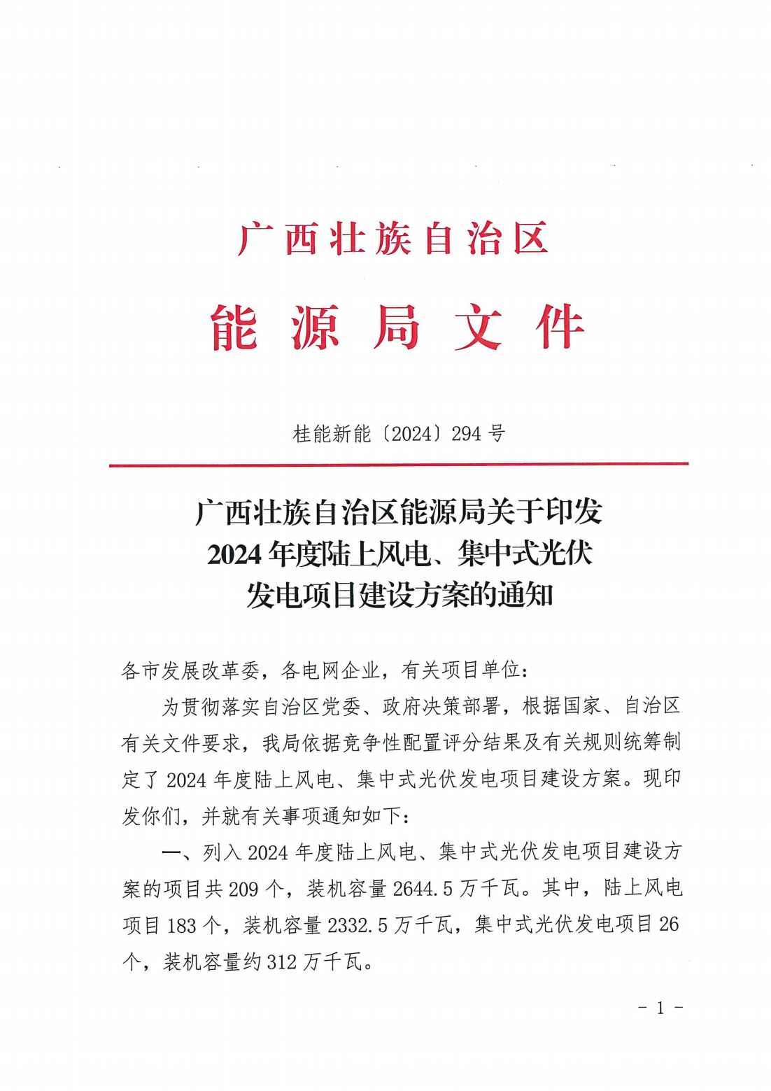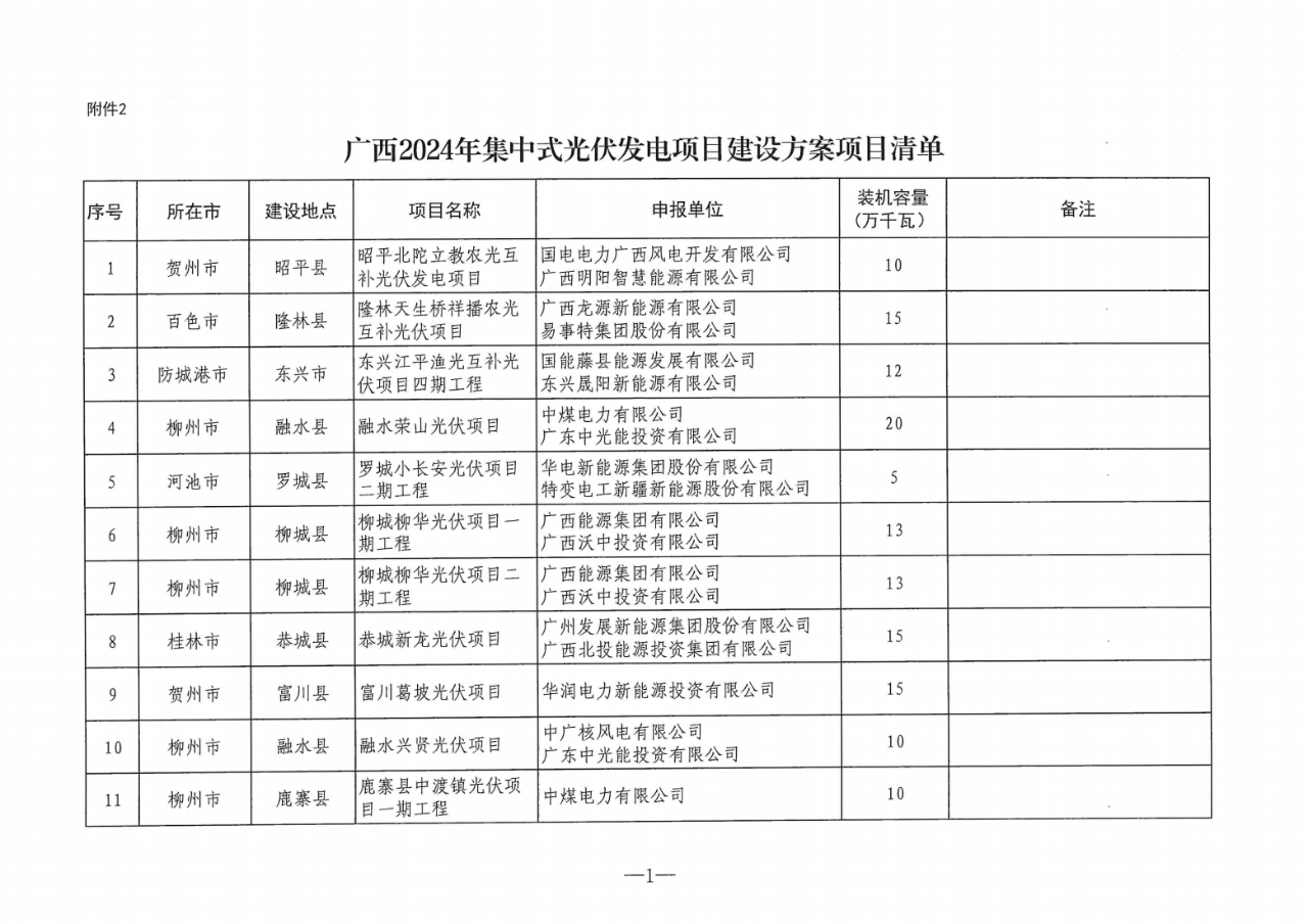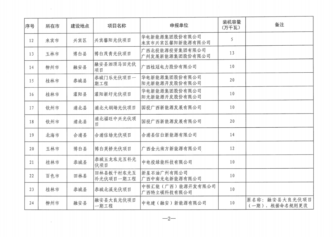 《通知》指出,列入广西2024年度陆上风电、集中式光伏发电项目建设方案的项目共209个,装机容量2644.5万千瓦。其中,集中式光伏发电项目26个,装机容量约312万千瓦;陆上风电项目183个,装机容量2332.5万千瓦。