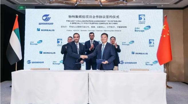 5. 阿布扎比国家石油公司、奥地利北欧化工(Borealis)、博禄化学(Borouge,由ADNOC与Borealis联合持股)联合体与万华化学旗下万融新材料(福建)有限公司签署项目合作协议,双方将组建合资公司,启动年产能160万吨的特种聚烯烃一体化设施的可行性研究,项目地点位于福建省福州市。联合体与万融新材料投资比例为50:50。