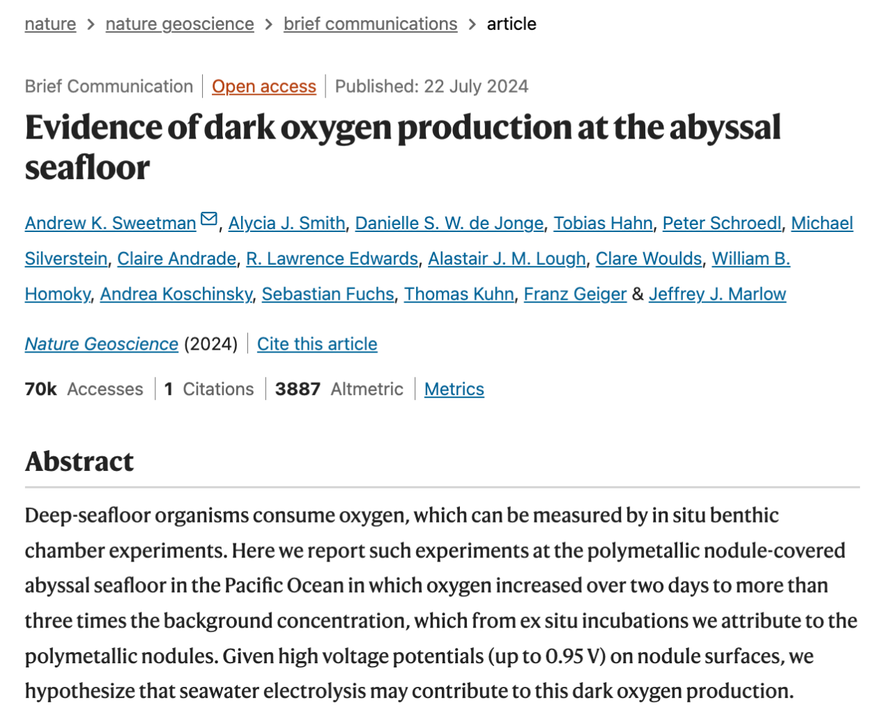 《自然·地球科学》杂志发表英国苏格兰海洋科学协会的安德鲁·斯威特曼教授领导的一个科学家小组发表文章,认为在海面以下约4000米(13100英尺)的完全黑暗中,土豆形状的金属结核正在产生氧气。这一发现违背了关于氧气如何产生的既有科学共识,甚至可能迫使人们彻底重新思考地球上复杂生命的起源。以前人们认为,只有植物和藻类等生物体才能通过光合作用利用能量来产生地球上的氧气,而光合作用需要阳光。除了对海洋科学的影响外,这项研究还引发了人们对深海采矿风险的新担忧。