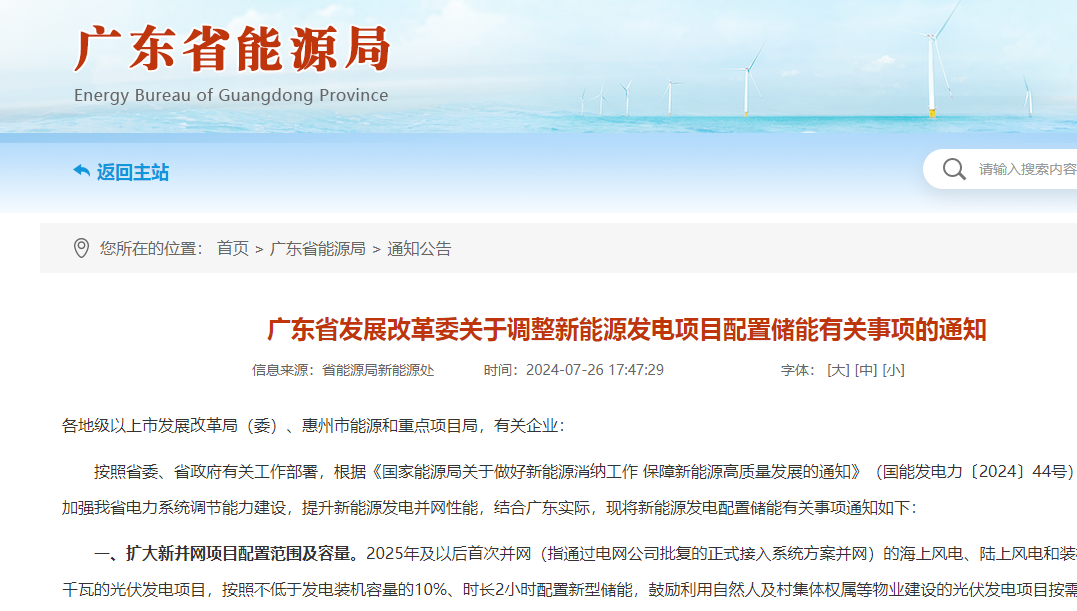 日前,广东省发改委印发《关于调整新能源发电项目配置储能有关事项的通知》。文件提出:2025年及以后首次并网的海上风电、陆上风电和装机容量大于3万千瓦的光伏项目,按照不低于10%/2小时配置新型储能,鼓励利用自然人及村集体权属等物业建设的光伏项目按需配置新型储能。