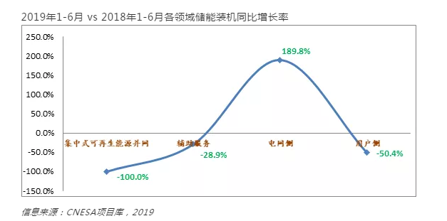 从储能在各个应用领域的装机看,集中式可再生能源并网上半年没有投运项目,增速最低;近几年非常活跃的用户侧储能陷入低迷;2018年项目扩张力度最大的储能参与调频辅助服务应用开始制动;2018年规划项目的投运使今年上半年电网侧储能的增长仍高居不下,但未来项目建设由于缺乏盈利渠道的支撑而举步维艰。减速调整似乎比大家预期来得要快要猛。