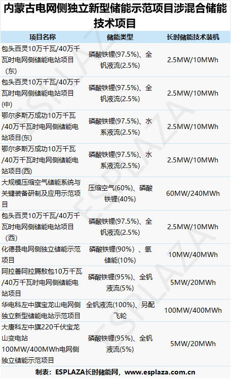 2024年4月-5月,内蒙古接连发布两批电网侧独立新型储能示范项目,其中涉及长时储能项目16个,更有10个采用了混合储能技术。