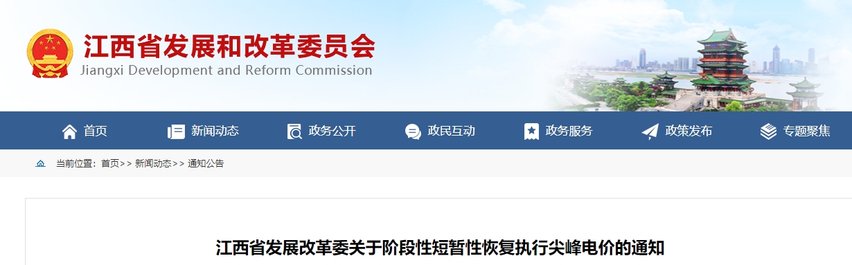 江西省发展改革委关于阶段性短暂性恢复执行尖峰电价的通知