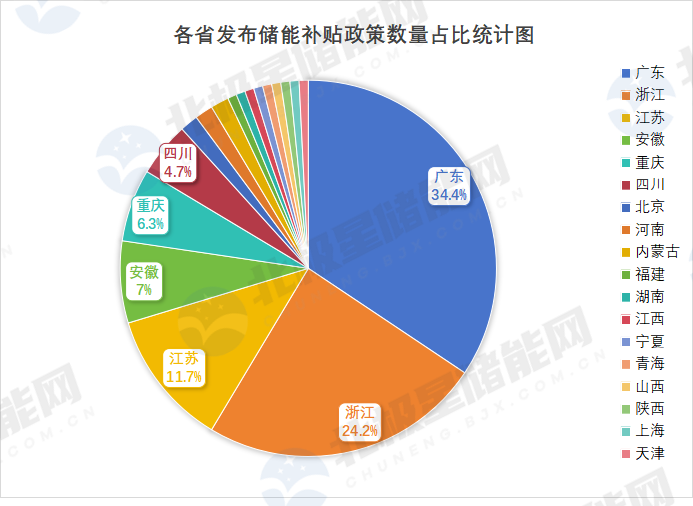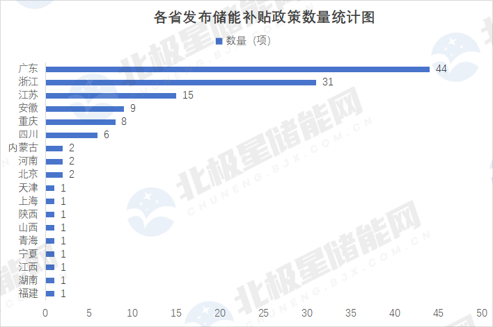 其次,浙江省共发布了31项储能补贴政策;江苏省位居第三位,共发布了15项储能补贴政策。三个省发布的储能补贴政策数量约占总数的70.3%。