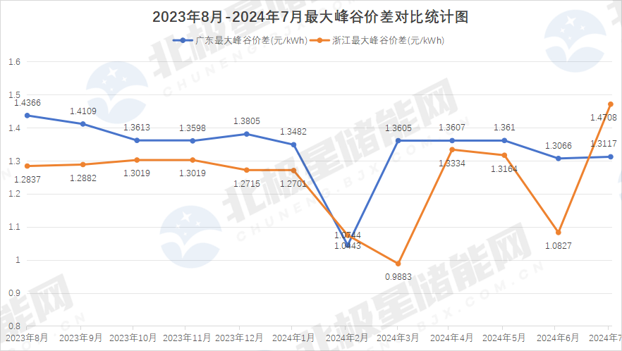 而同一时间范围内,广东曾出现的最大峰谷电价差最高为1.4366元/kWh,最低为1.0443元/kWh,其平均值高达1.3368元/kWh,这一数值在全国稳居前列。