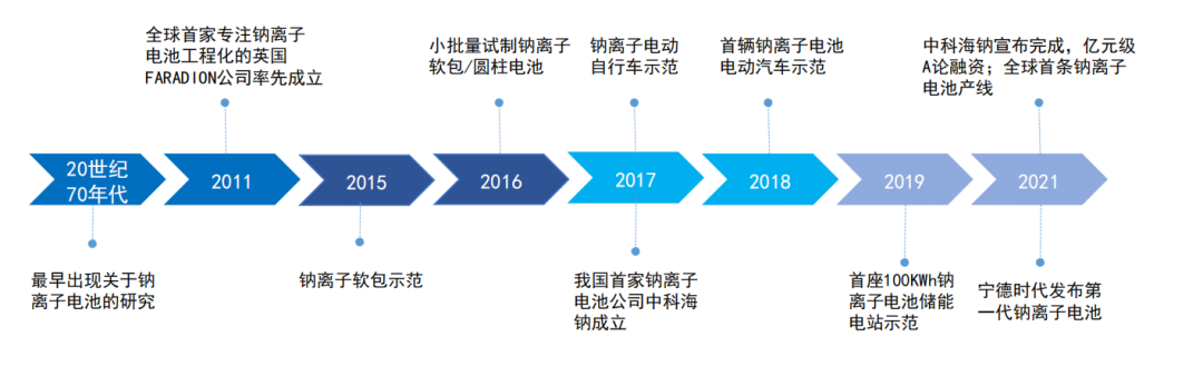 • 钠离子电池由来已久,与锂离子电池原理相同。钠离子电池最早由ARMAND团队于20世纪80年代提出,在90年代经过产业化推广得到技术应用。钠离子电池本质是在充放电过程中由钠离子在正负极间嵌入脱出实现电荷转移、而锂离子电池是通过锂离子在正负间移动来进行电荷转移,工作原理实质上相同的。