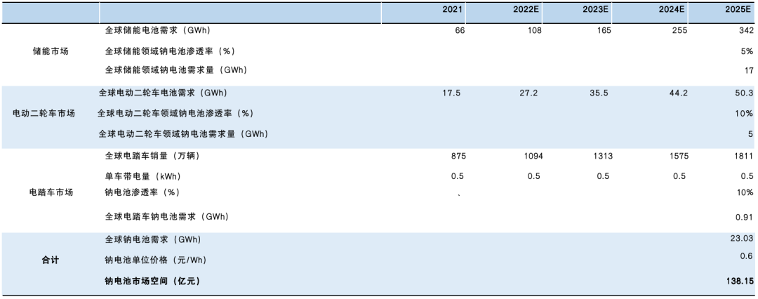 • 合计全球钠电池2025年需求为23GWh,假设单位价格0.6元/Wh,2025年钠电池市场空间为138亿元。
