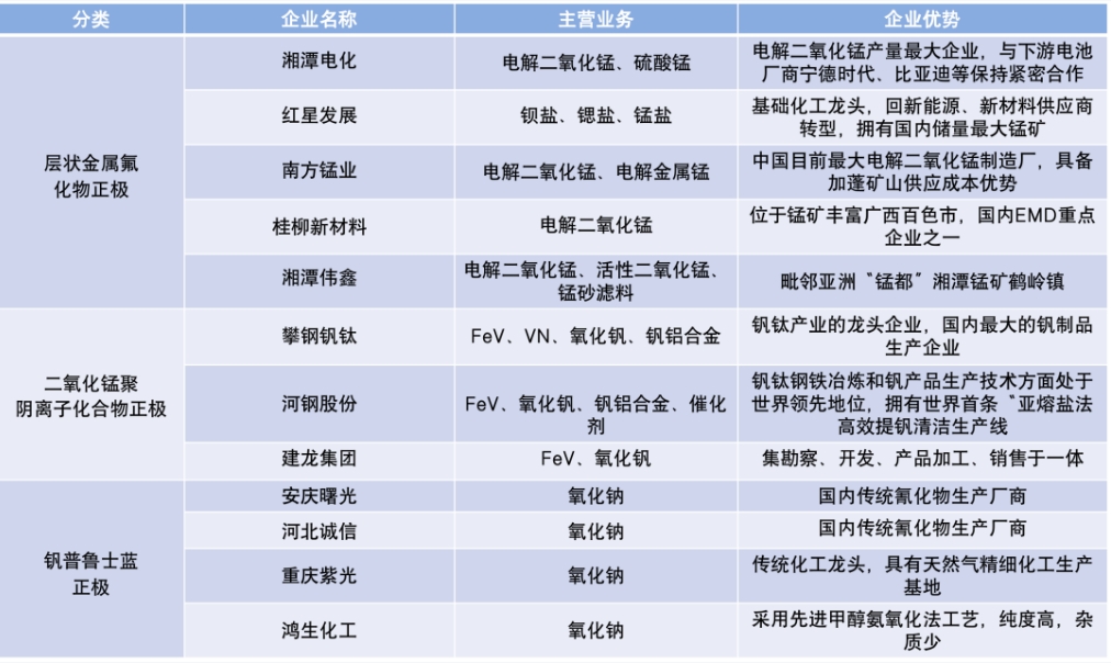 当前主流的钠离子电池正极材料主要有层状氧化物、普鲁士类化合物、聚阴离子化合物等。代表性企业主要有湘潭电化、攀钢钒钛、安庆曙光等。